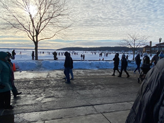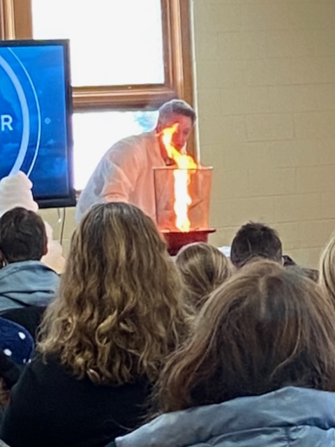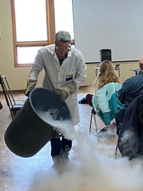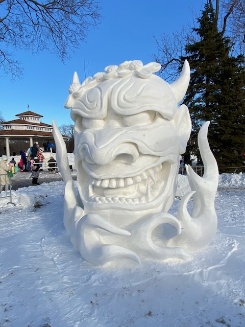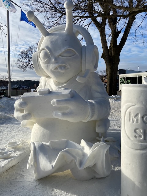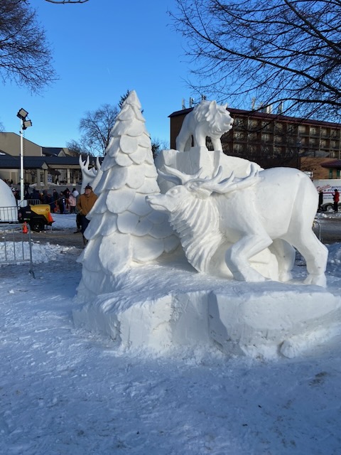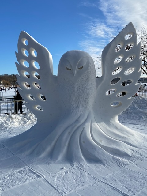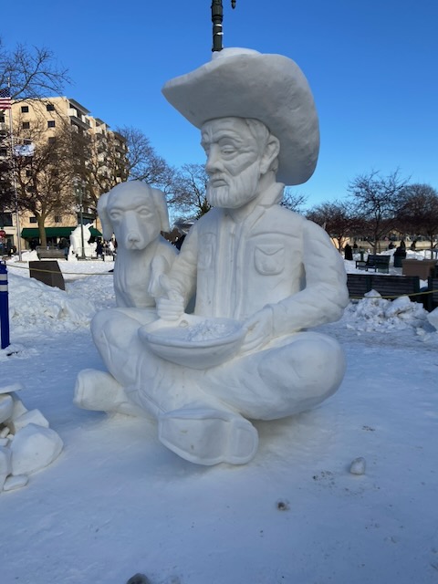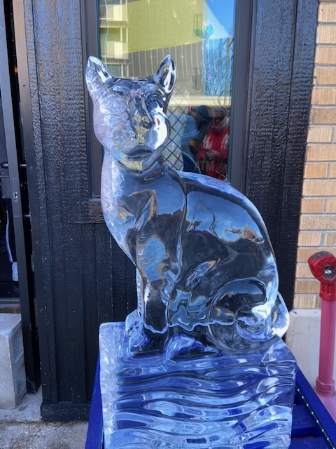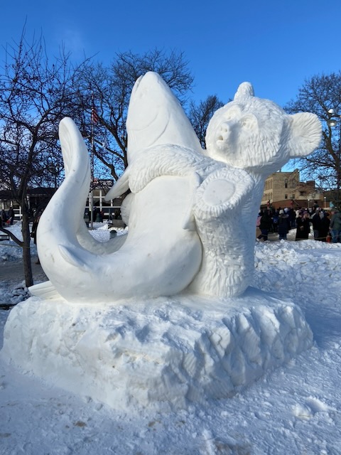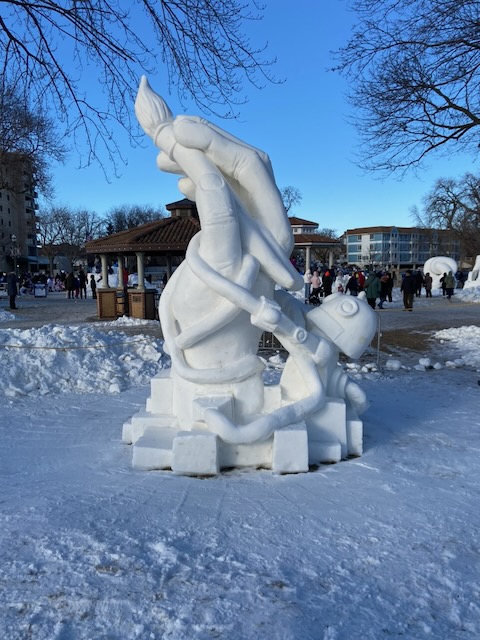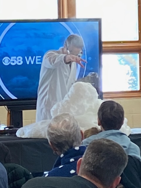 Gearing up…Ah-h-h! After the work is done!This was one of the warmer days!Drew Burgoyne, meteorologist at Waukesha’s JamboreeMaking a fire tornadoCreating cloudsLake Geneva’s WinterfestIce sculptures in Lake GenevaLake Geneva snow sculpturesA cat on ice…Look closely: that’s a hawk with a silent, very observant squirrel !